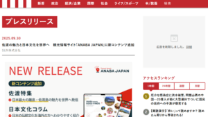インバウンド旅行者向け地域観光サイト「ANABA JAPAN」に、新コンテンツ「佐渡特集」と「日本文化コラム」が追加されたことが、メディアに掲載されました。